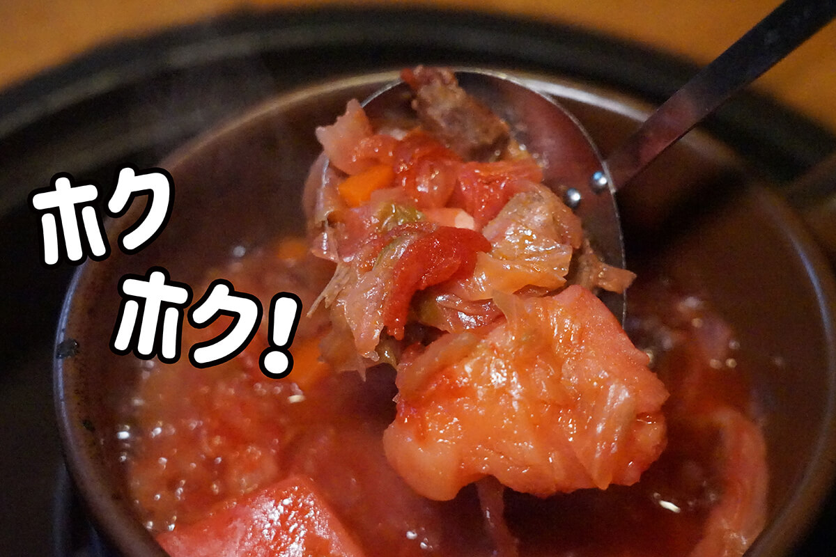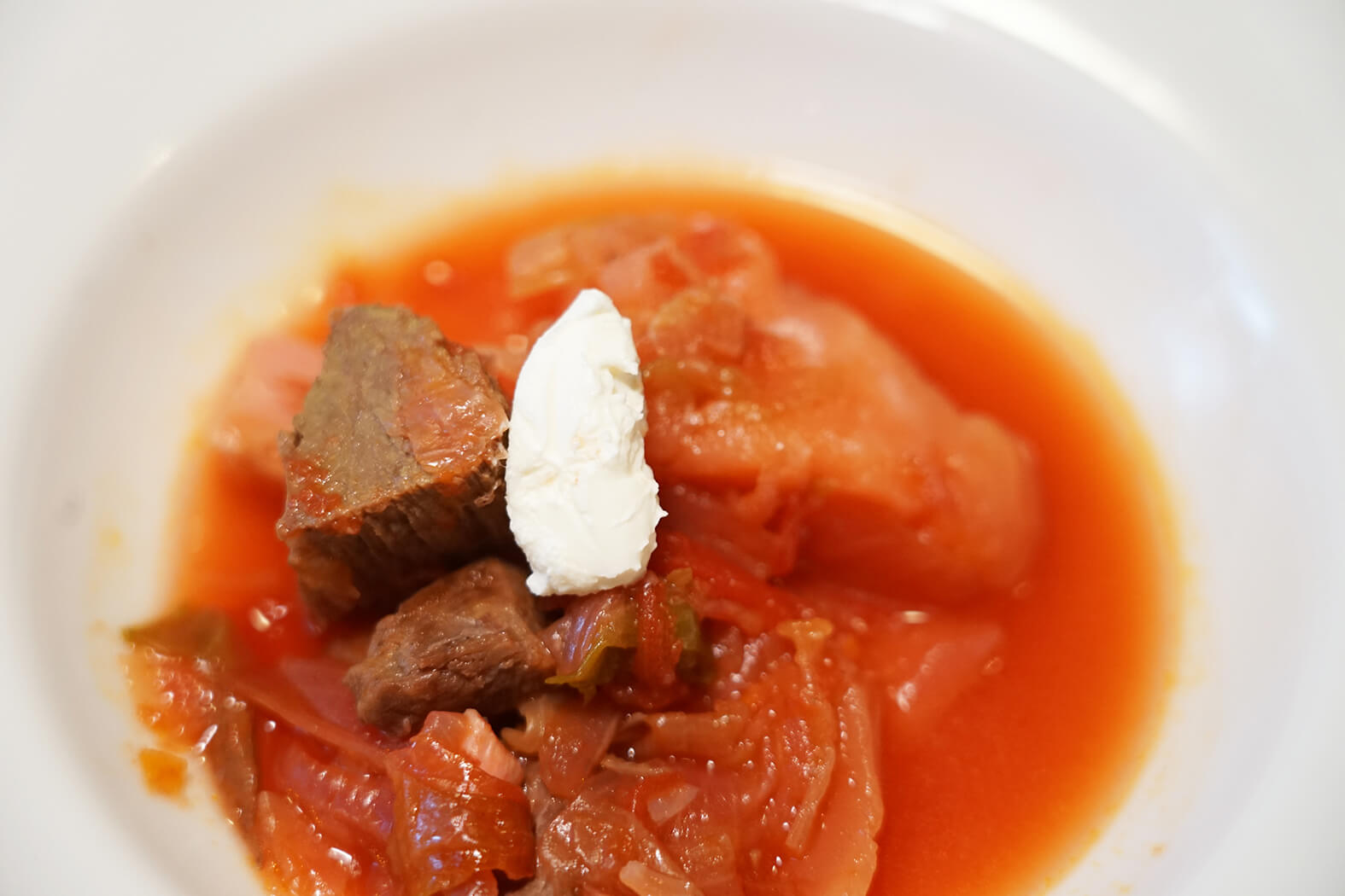 次は、ウクライナの代表的な鍋料理「ボルシチ」をいただきます。真っ赤なスープの色は、ビーツの鮮やかさによるもの。