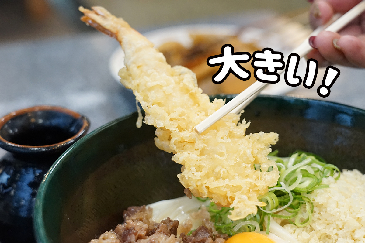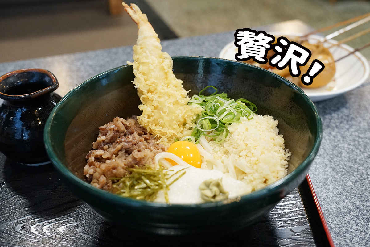 ひとつひとつの具材がしっかり主役を張る、冷やしスタミナぶっかけうどんも注文しました!えび天の香ばしさに加え、旨みの詰まった牛肉、とろろと卵のまろやかさ、サクサクの天かすの食感とネギの爽やかさが重なり合います。だしをかけると、全体がひとつにまとまって、完成度の高い味わいに。