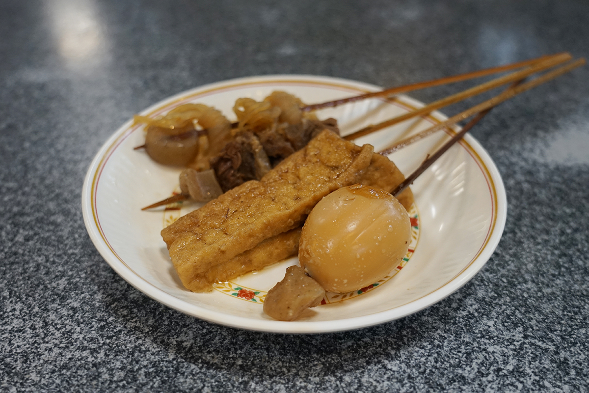 選んだのは、厚揚げと卵、糸こんにゃく、そしてやわらかく煮込まれたお肉。全てにしっかりとだしの味が染み込んでいて、店のやさしい味づくりが表れています。自家製の味噌とからしをつけると、さらに格別に。