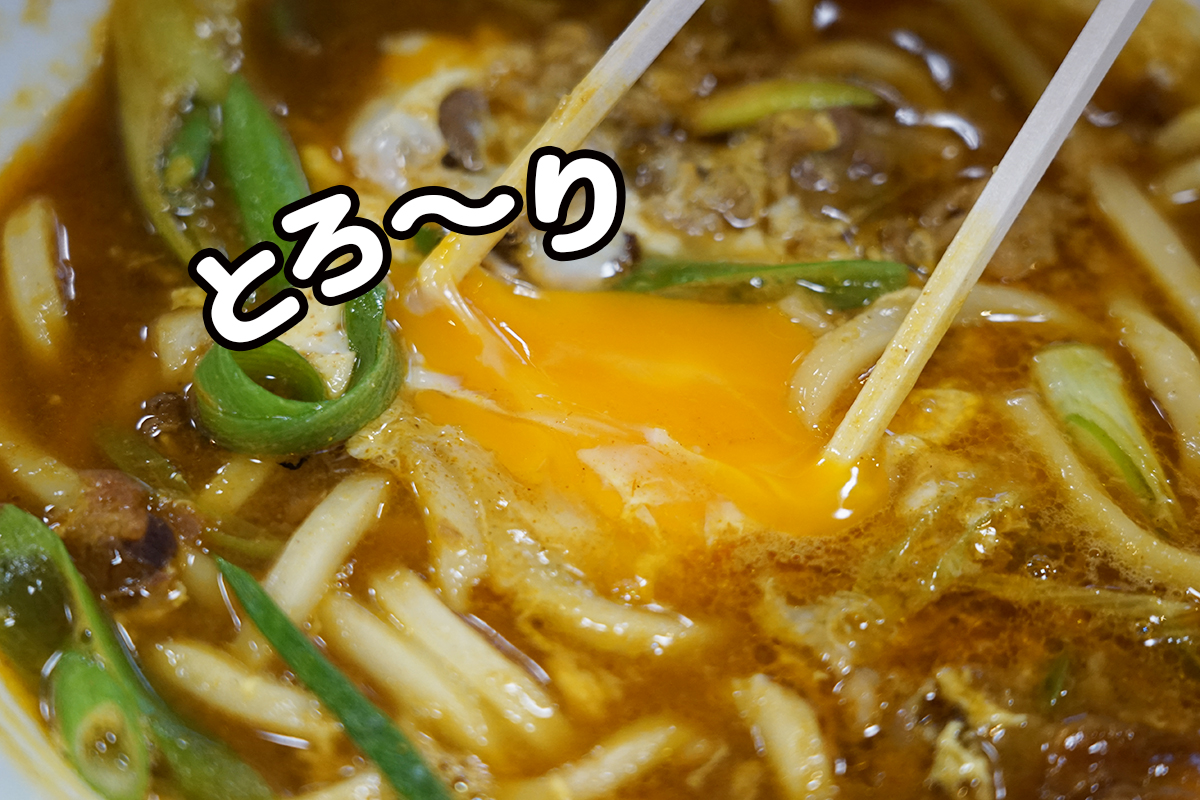 そこに添えられた生卵と、甘辛い牛肉が絶妙にマッチ。一緒に白米を食べたくなる満足度の高い一杯でした!