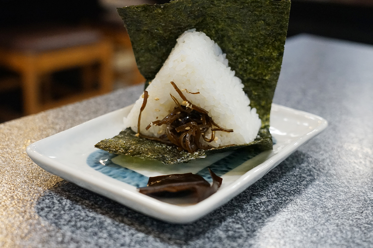 一緒に注文したおにぎりは、注文が入るごとに握ってくれるので、いつでも握りたてが味わえます。おにぎりから溢れそうなほどたっぷりの昆布がうれしい!カレーうどんとの相性も抜群で、添えるだけで食事の満足度がぐっと高まります。
