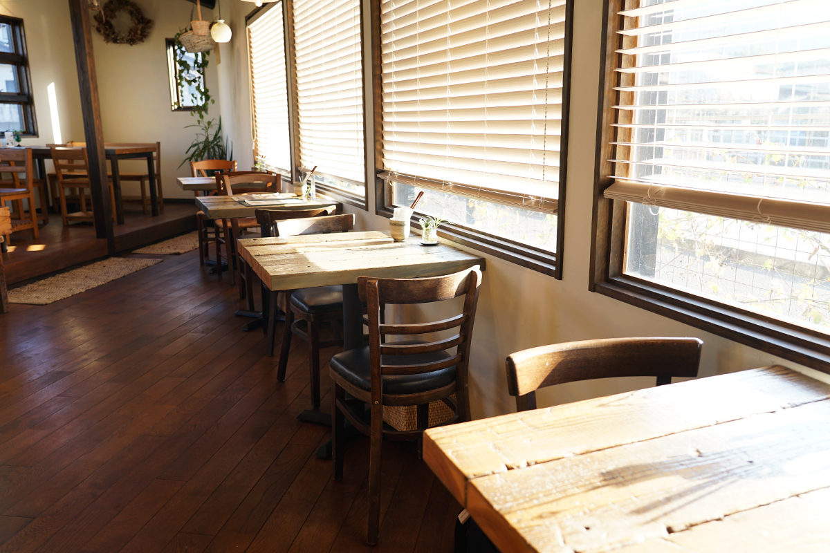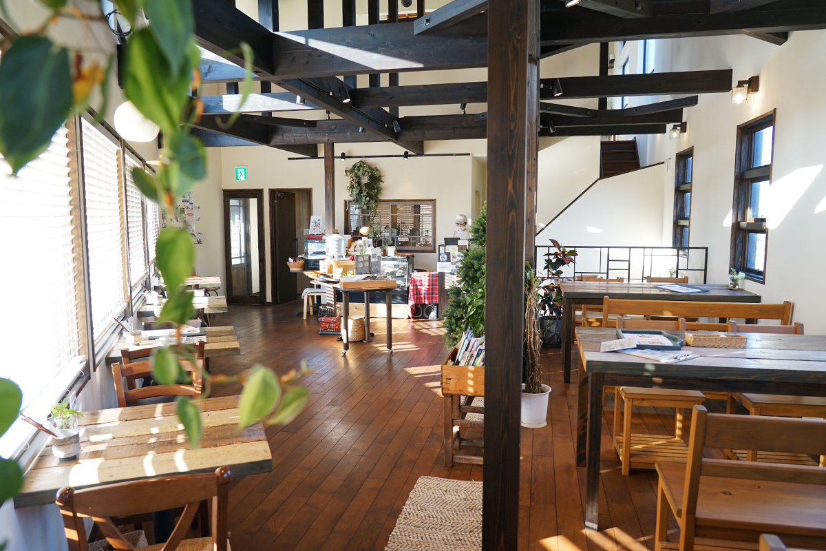 ウッド調で統一された店内は、静かで落ち着いた空間。窓の外には、丹原町ののどかな田園風景が広がり、その景色に寄り添うようなBGMが、ゆったりと流れています。