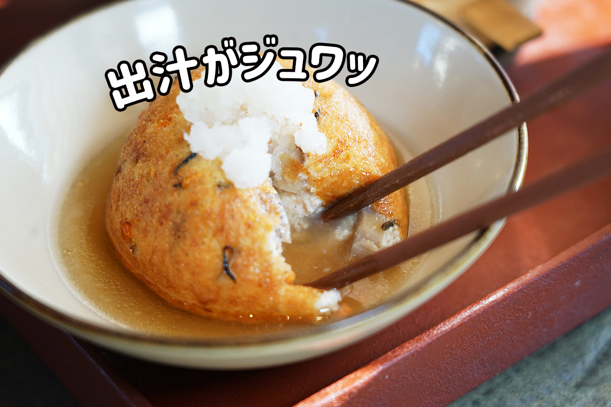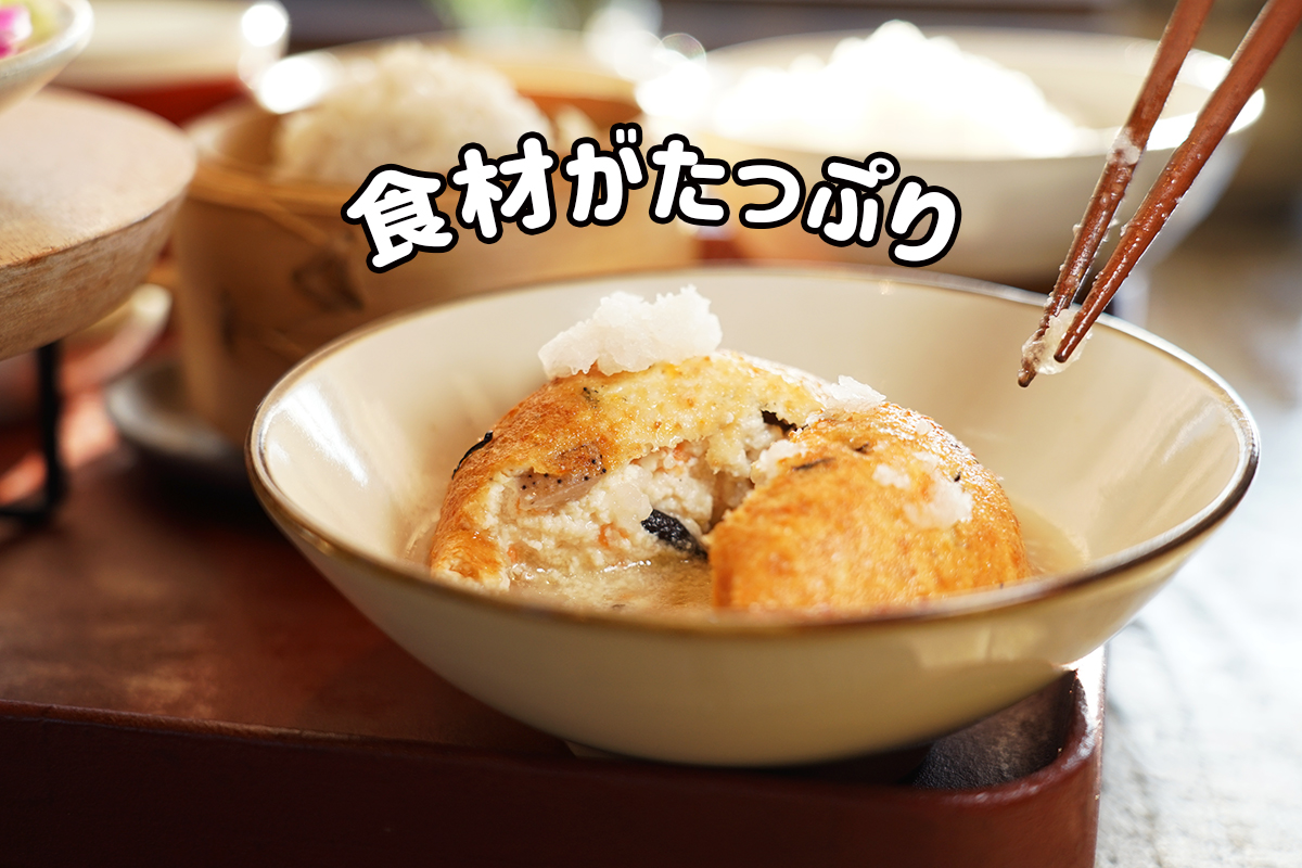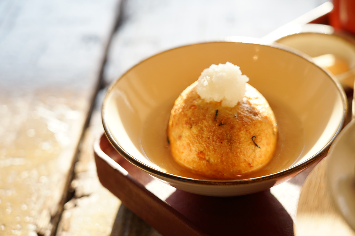まず目を引くのは、ふっくらと揚げられたがんもどき!西条市を中心に砥部焼を作る法皇窯にオーダーメイドで作ってもらった、がんもどき専用の器に、だしの温泉に浸かった熱々のがんもどきが鎮座しています。