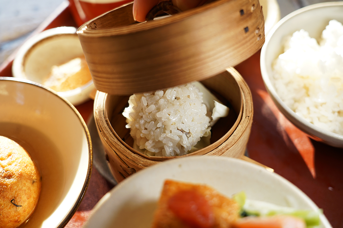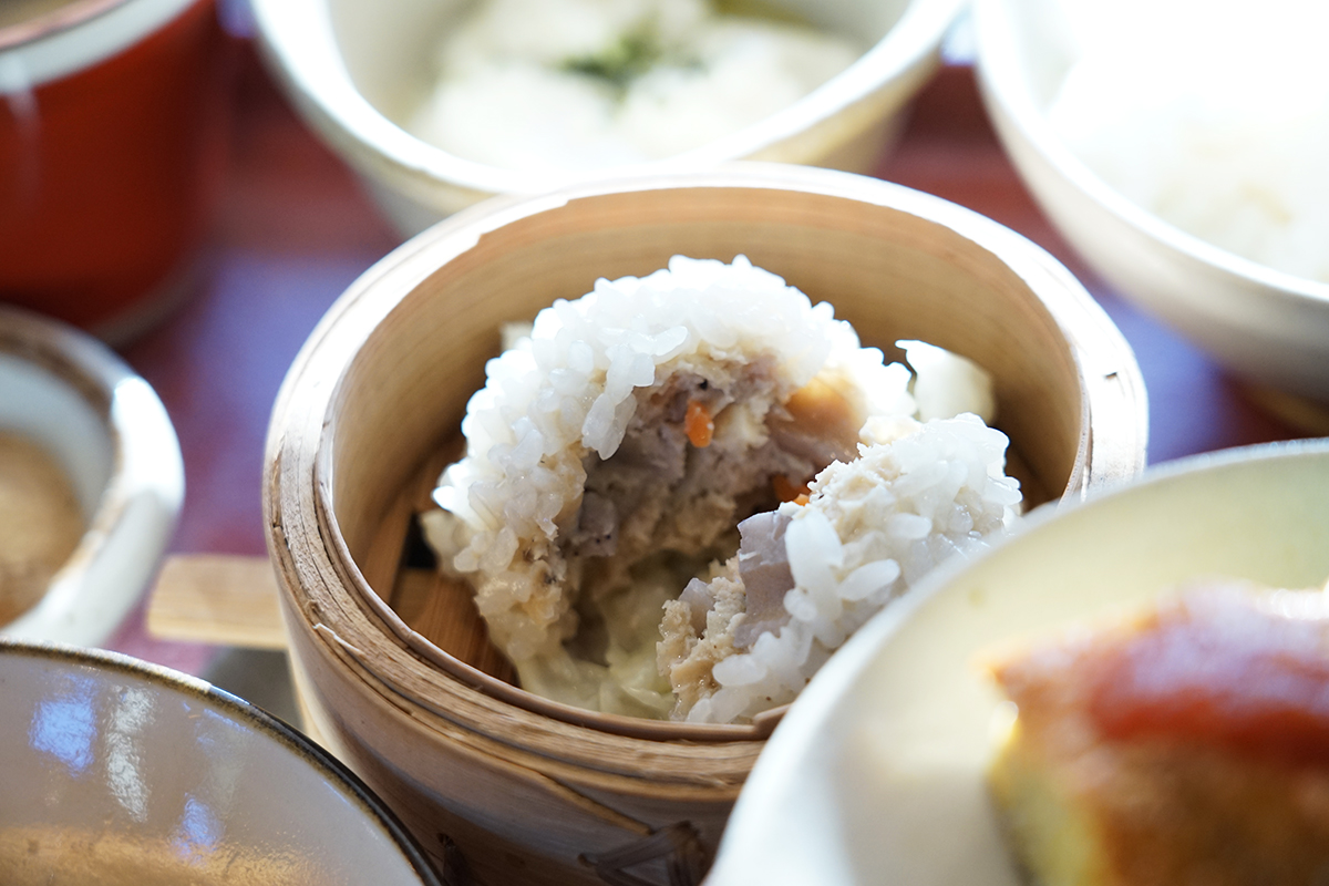 蒸しシュウマイは、がんもどきのタネや野菜、挽き肉を合わせ、表面をもち米で包んで蒸し上げた一品です。ひと口食べると、もち米のもちもちとした食感と、具材の旨みがじんわりと広がります。