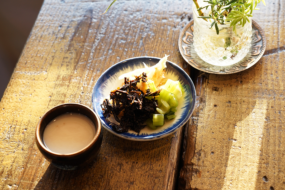また、どちらのセットにも甘酒とお漬物が付いていて、セルフで自由に取ることができます。