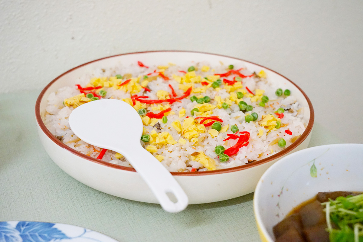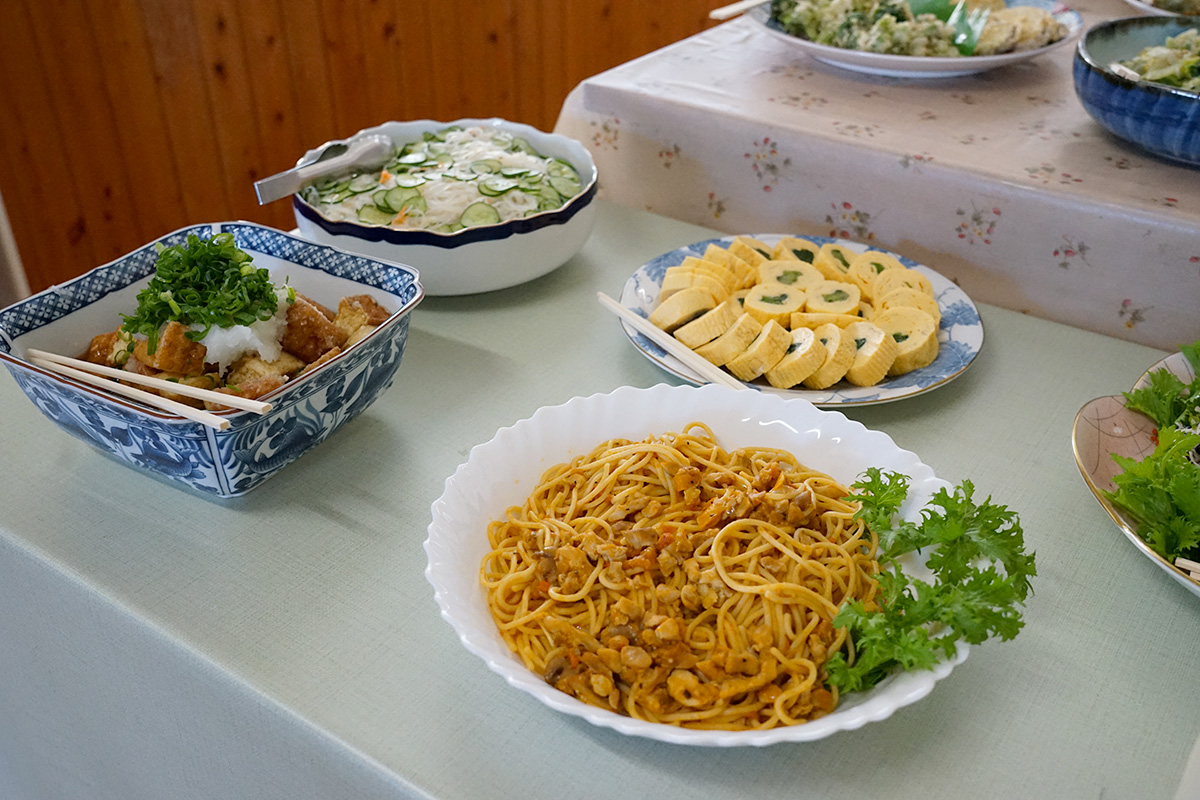 米粉パンや地元の旬な野菜などを使ったおかずなど、色とりどりのお料理が並びます。ごはんもちらし寿司や炊き込みごはん、白ごはん、カレーなど種類豊富。どれにするか悩みます…
