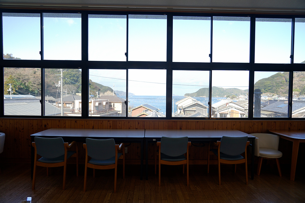 いざ座席へ!1階の図書室でも食べられるとのことですが、今回は2階のランチルームに行ってみます。中へ入ると、窓からの景色にびっくり!なんと海を望めるではありませんか!