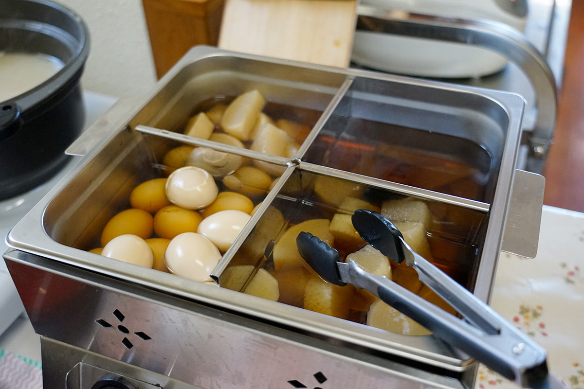 悩みに悩み抜いて料理を取り、さてそろそろ食べようかと思った時に目に飛び込んできたのは、おでん!出汁のいい香りに誘われて、思わずプラスワンしてしまいました。