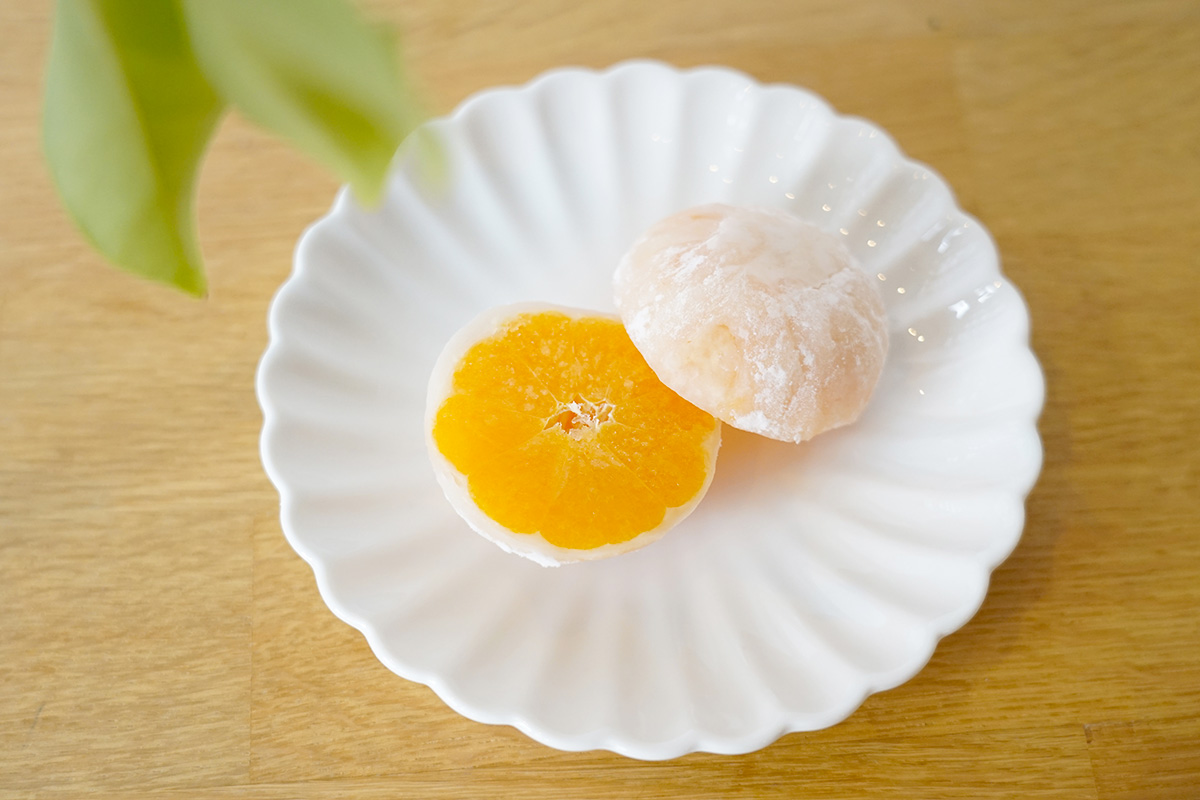 「みかん完熟大福」は、厳選されたSSSサイズのみかんを、白あんと求肥でやさしく包んだ一品。解凍前にカットして、30分ほど経った頃が食べ頃とのこと。