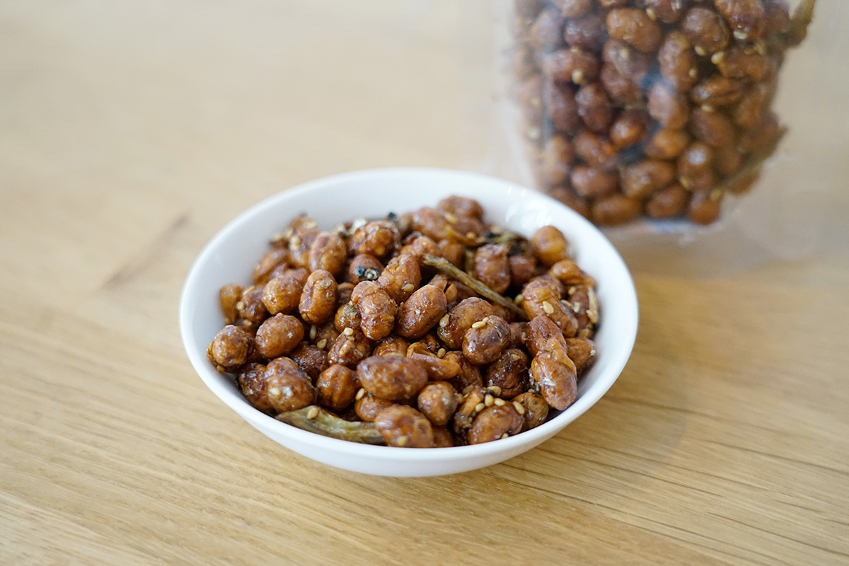「元気もん」は地元のおばあちゃんから直伝された、大豆といりこをカラッと揚げ、醤油と砂糖でからめたお菓子。