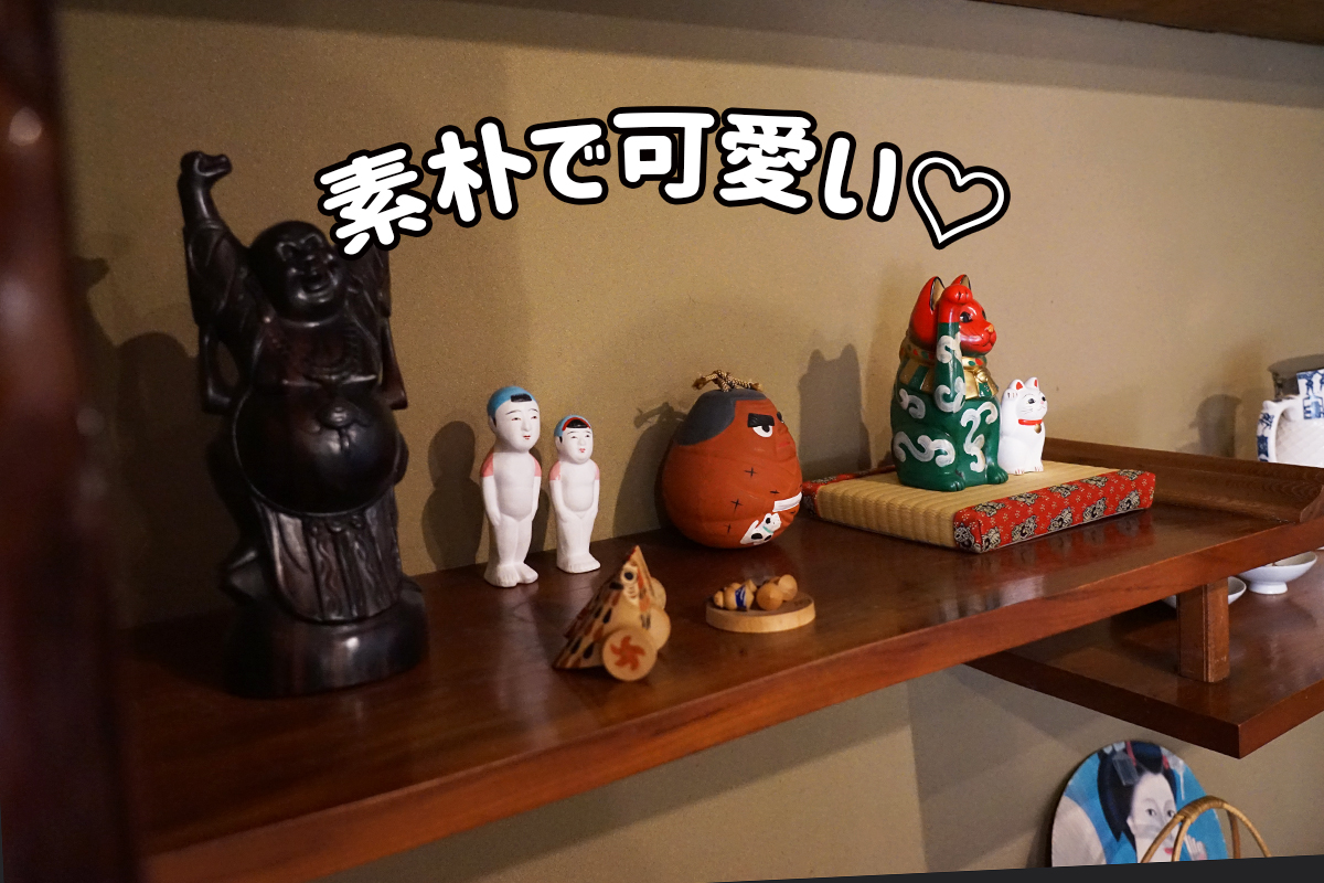 棚や壁のあちこちには民芸品や古道具が飾られていて、古道具好きとしては思わず目を奪われます!