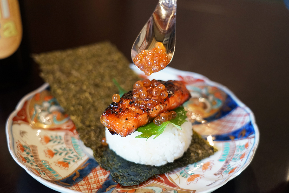紅鮭照り焼きのおむすびイクラのせは、スプーンでイクラをたっぷりとかけながらいただくスタイル。 ひと口ごとに贅沢な味わいが広がります。