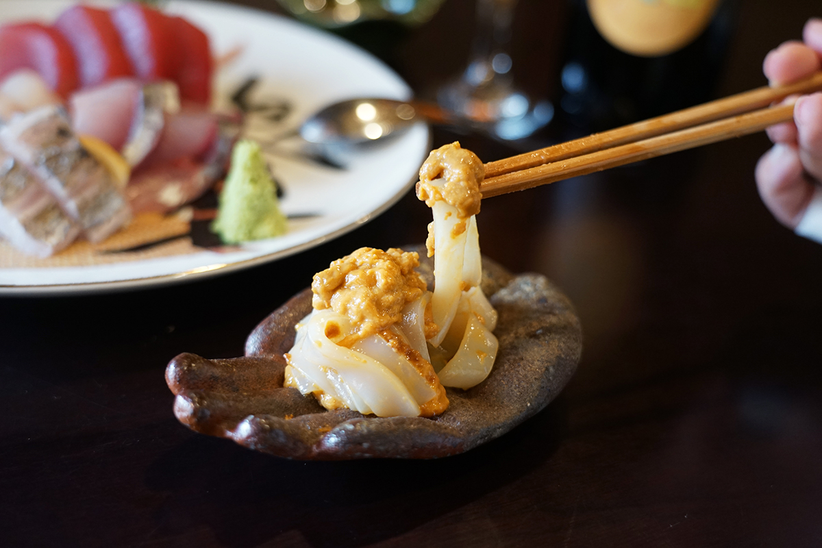 紋甲イカのウニ和えは、紋甲イカの甘みとウニのコクが重なり合い、シンプルながらも奥行きのある味わいが楽しめます。ほんのりお醤油が効いていて、素材の旨みがより引き立つ一品!